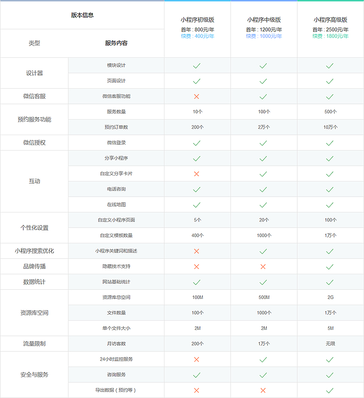根據(jù)功能不同,我公司小程序有三個版本,價格分別為:800元(續(xù)費400元),1200元(續(xù)費1000元),2500元(續(xù)費1800元),以上價格為已有認證微信公眾號的報價,如需代理開通微信公眾號首年另加500元 詳細功能介紹 >>